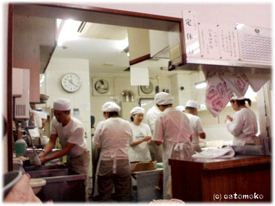 厨房ではたくさんの従業員さんが、次々やってくるお客さんの肉まんをせっせと作っていました。