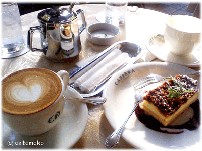 お向かいには外国の高級ブランドのお店があり、カプチーノとクルミチーズケーキとともに、まるで外国にいる様な気分を味わいました。