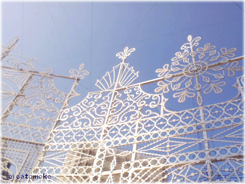 その中で、雲ひとつない空を背景にルミナリエの繊細な模様が浮き立ち、異空間に迷い込んだようでした。